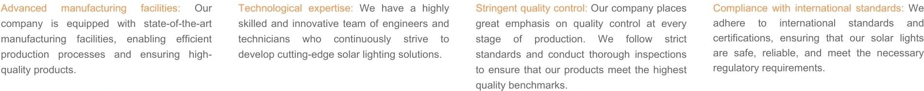 Som et anerkjent selskap i bransjen har vi en betydelig størrelse og et robust team. vårt firma er stolt av sine dedikerte fagfolk som jobber i ulike avdelinger som forskning og utvikling, produksjon, kvalitetskontroll, salg og kundeservice. Med sin kombinerte ekspertise og innsats sikrer teamet at driften fungerer jevnt og leverer høykvalitets solcellebelysningsprodukter.
