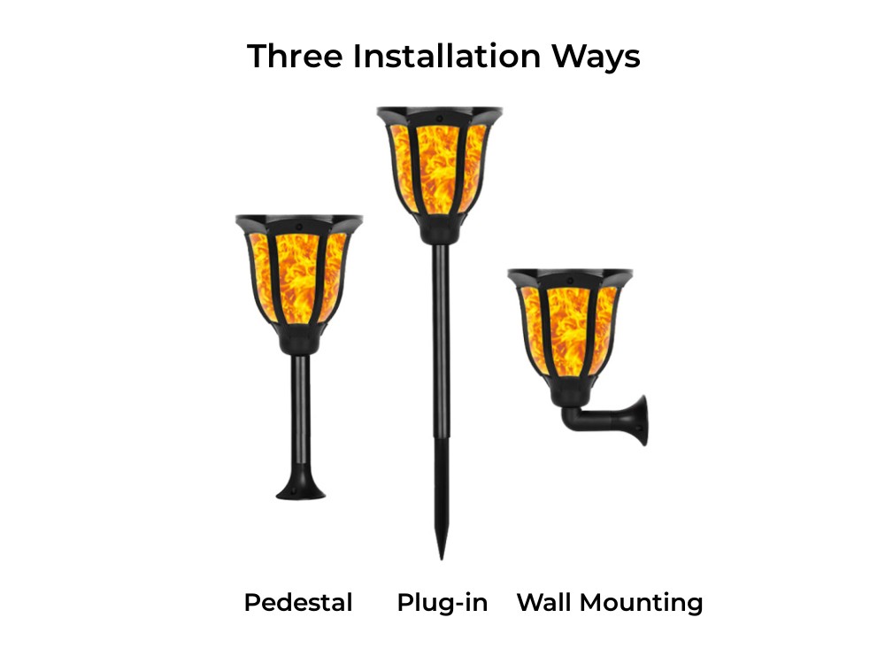 - Flammen solar fakkel lysene kan settes inn bakken, settes på bordet eller installert på veggen;